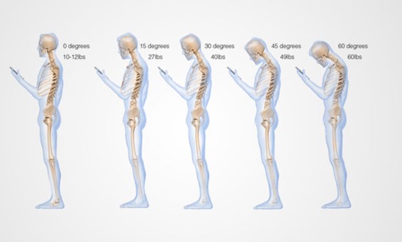 頚部の屈曲(前屈)角度次第で、頚椎には小学生が乗るくらいの負荷がかかっています。